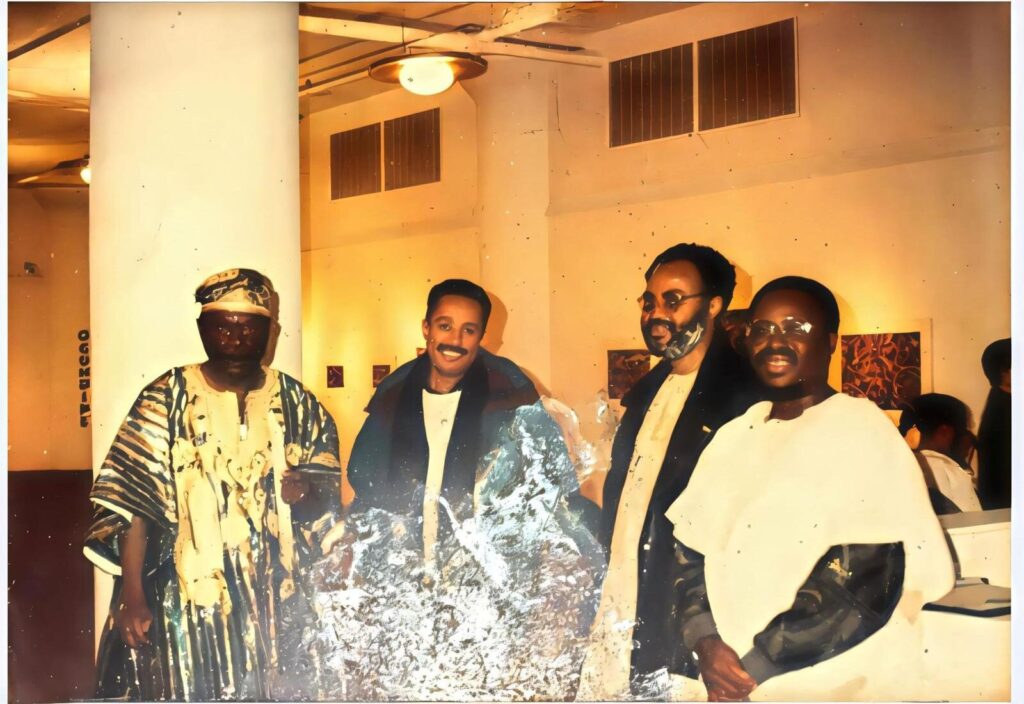 He showed widely in Nigeria and abroad, including at the Goethe Institute in Lagos, the Smithsonian Institution in the USA, the Institute of Contemporary Arts in London, and galleries in Munich, Paris, Vienna, and Prague, among others.